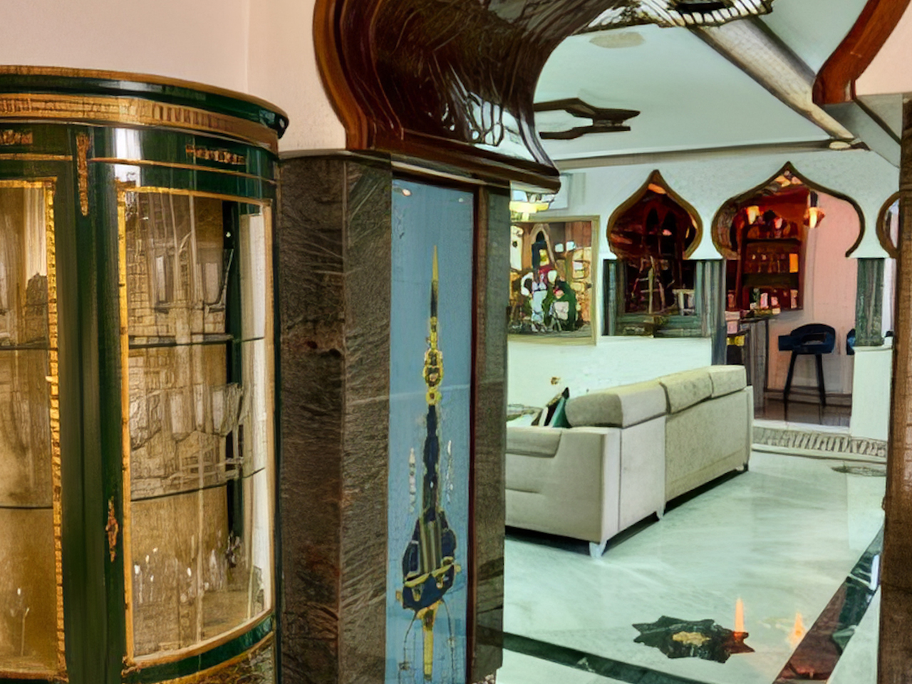 La Villa Árabe es un oasis de lujo inspirado en las Mil y Una Noches, situada junto al Paraje Natural de Punta Entinas-Sabinar y a tan solo 10 minutos de la playa. Su imponente cúpula azul es el centro visual de la villa, evocando la grandeza y la magia de los antiguos palacios árabes. Los interiores son igualmente impactantes, decorados con frescos originales del renombrado artista Waldi Wrobel, celosías iluminadas, y fuentes árabes interiores que añaden serenidad y elegancia a los espacios. Los suelos de mármol, arcos de madera tallada, azulejos andalusí y nazari, y carpintería de pino tea crean una atmósfera de lujo y exotismo. El dormitorio principal, con una cama de dosel y baño en suite, se abre a una gran terraza con vistas al jardín.